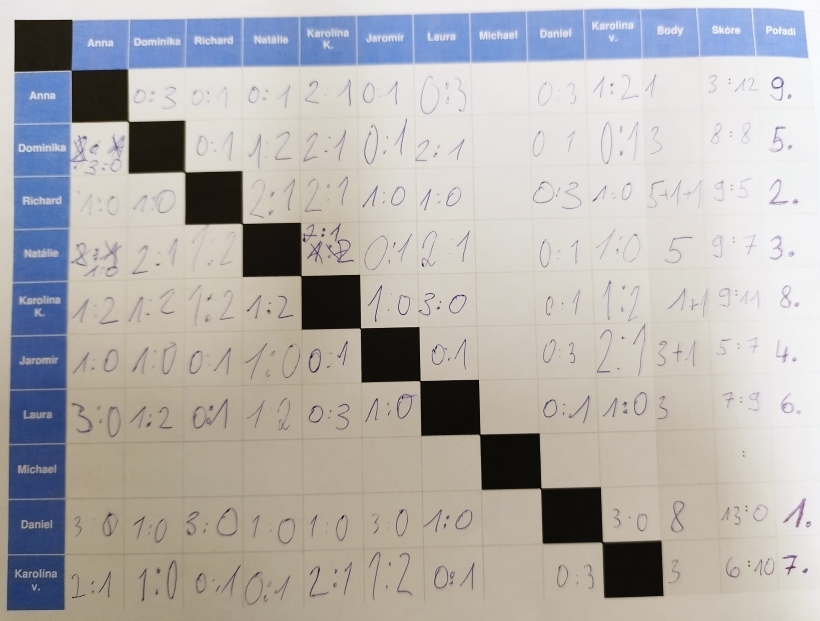 Suverénním vítězem se stal Daniel Stránský, který ani jednou neprohrál, na druhém místě se umístil Richard Hasoň a třetí skončila Natálie Koberová.
