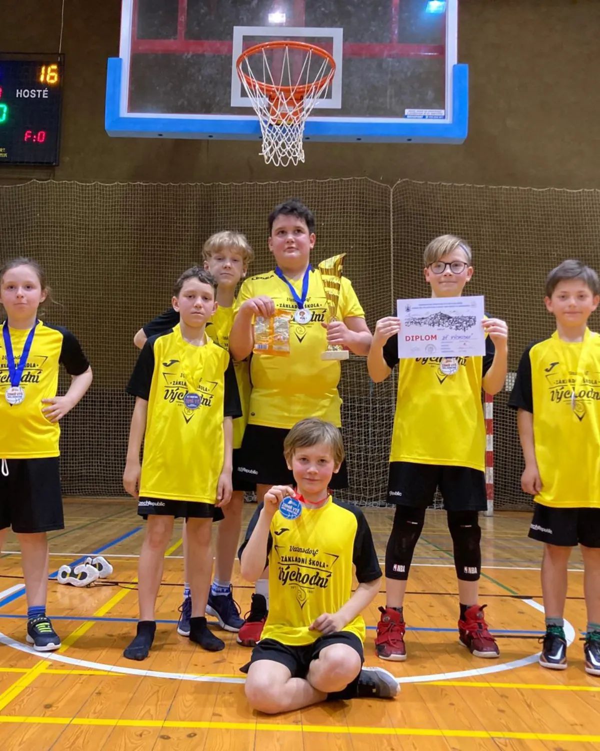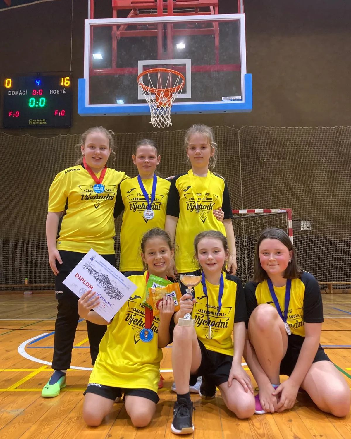 V úterý 2. května se naši žáci (1.stupeň) zúčastnili v rámci Olympiády města Varnsdorf turnaje v košíkové. Minulý rok v podstatě ty samé děti skončily v obou kategoriích na posledním místě. Více než samotný výkon nás loni mrzel přístup některých hráčů. Vše jsme si vyříkali a letos to byla úplně jiná „káva“. Chlapci i přes jednu nešťastnou porážku skončili první, děvčata třetí. Pochválit zaslouží úplně všichni. Mimořádný výkon předvedl Jakub Mareš z páté třídy.