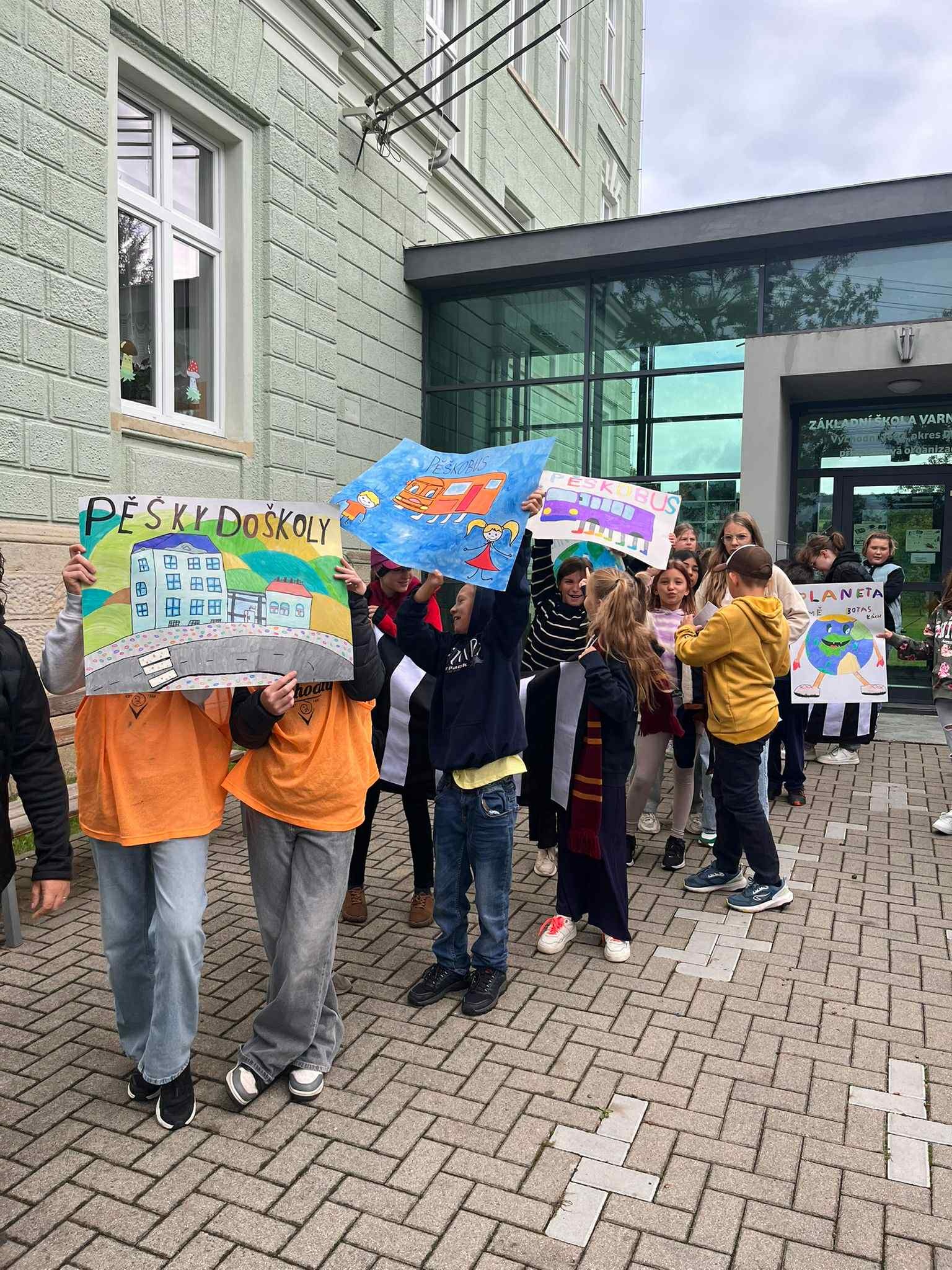 V rámci výuky jsme vytvořili plakáty, kterými jsme chtěli podpořit chůzi do školy místo jízdy autem. V komunitním kruhu jsme si povídali o tom, proč je chůze prospěšná – například pro naše zdraví, životní prostředí i bezpečnost kolem školy.