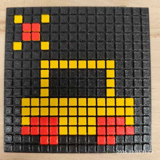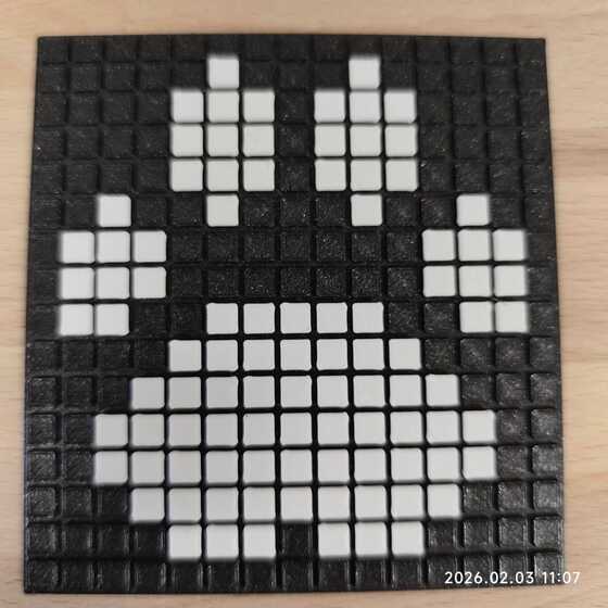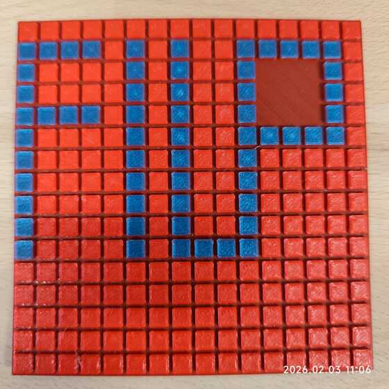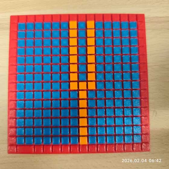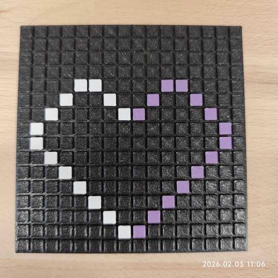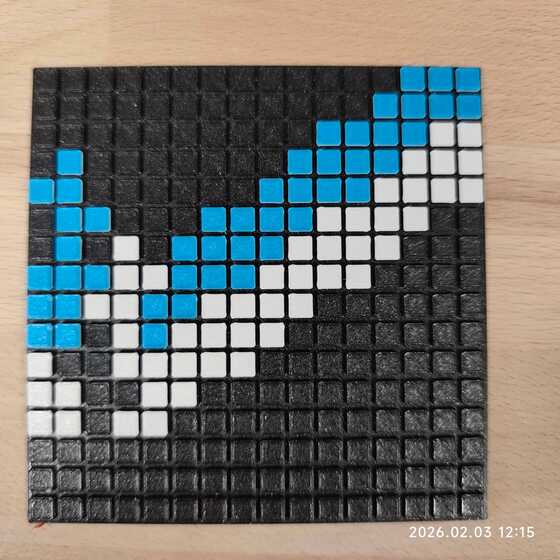Žáci obdrželi čtverečkovaný papír a jejich úkolem bylo vytvořit vlastní pixel‑artový motiv o maximální velikosti 16×16 pixelů. K dispozici měli pouze tři barvy. Zároveň bylo důležité zvolit takový motiv, který není závislý na konkrétních barevných odstínech, protože u 3D tisku nelze předem garantovat přesné barvy materiálu.Každá zvolená barva zároveň představovala určitou výšku výsledného čtverečku v 3D modelu. Žáci tedy museli ke svému návrhu přiřadit výšky jednotlivých vrstev.