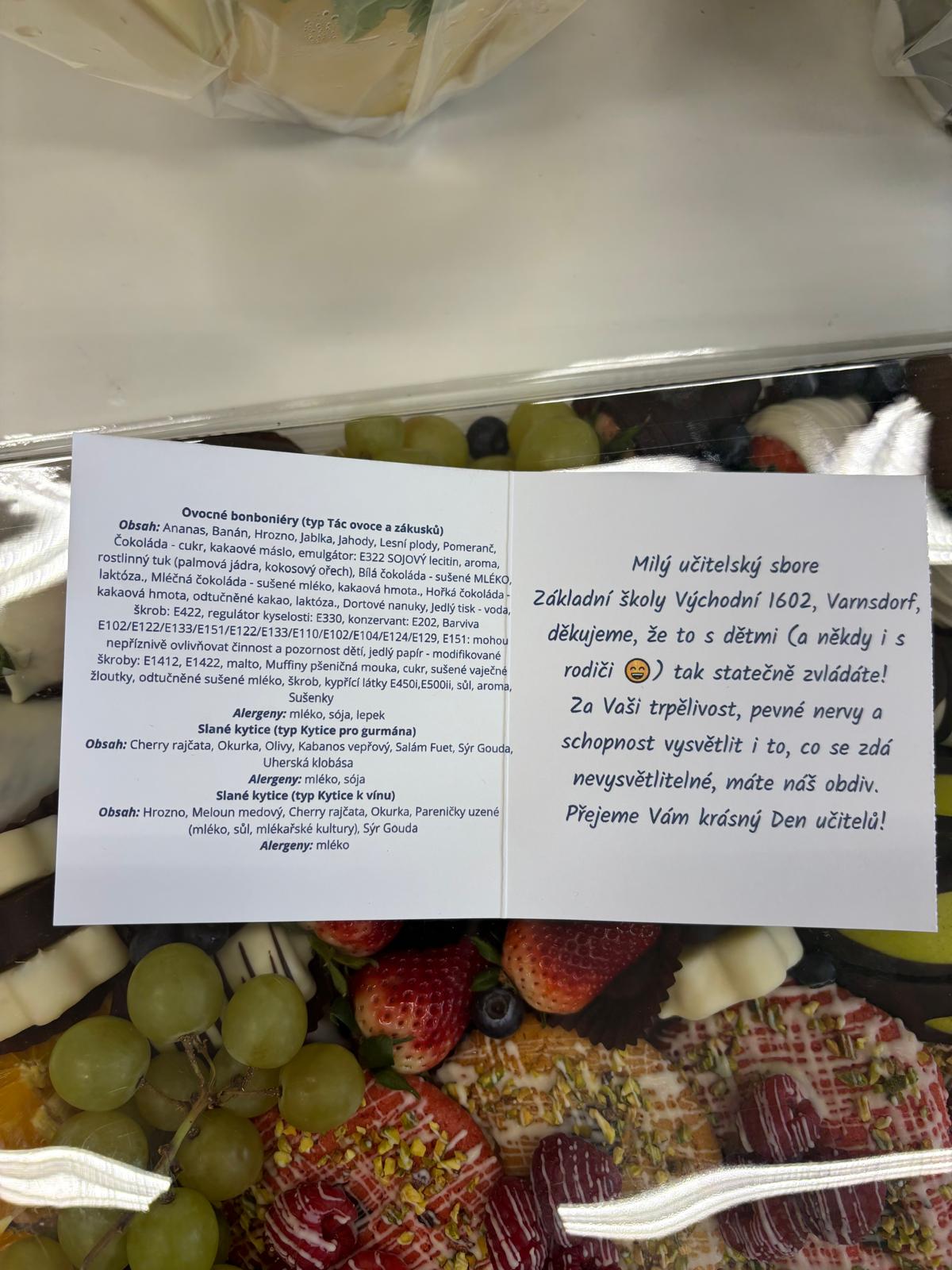 Děkujeme předsedkyni školské rady Stanislavě Vaňkové za nejen krásný a chutný dárek ke Dni učitelů, ale také za milé přání.