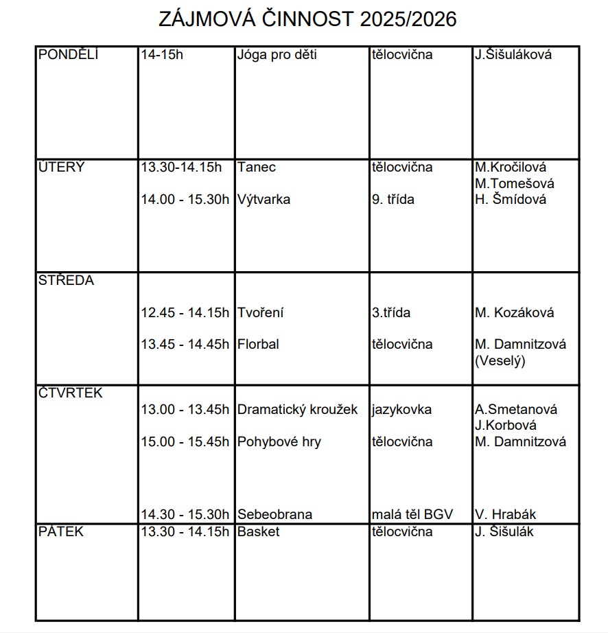 Úvod > O škole > Projekty školy > Zájmové kroužky 2025-2026 Zájmové kroužky 2025-2026 5.12.2025 Přehled zájmových kroužků v tomto školním roce Zpět